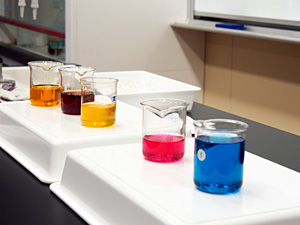 5種類のビーカーの溶液を半分ずつ隣のビーカーに混ぜていくと、毎回色が変わっていきます。子どもたちは驚きながらも「次は青!」と予測します。
