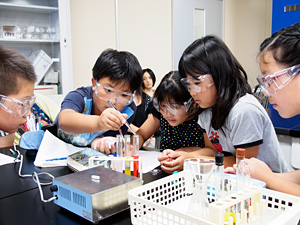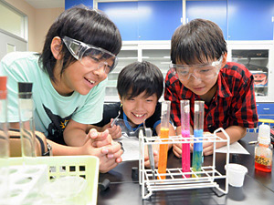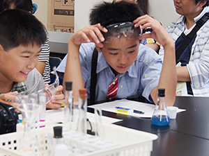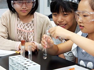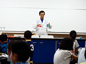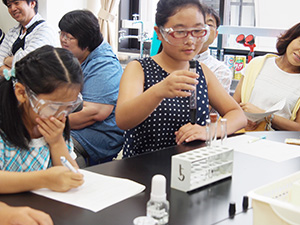 試験管やビーカーを使った、本格的な化学の実験が楽しめる『色の変わる化学反応』です。担当の相馬先生から「今日行う実験は5種類です」と説明と諸注意がありました。