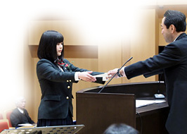 3月1日(日)、今春(2015年春)秀光が移転する宮城野校舎のゼルコバホールを会場に、秀光の第12回目の卒業証書授与式が行われました。秀光中等教育学校の前身である秀光中学校が誕生して以来の14期生29名が6年間の学校生活を終え、新たなスタート地点に立ちました。 一人ひとりの6年間の栄光を讃えて 卒業生の名前が呼ばれて卒業証書が手渡され、成績優等賞など各賞が発表されました。さらに6年間の功績を讃える 『秀光グランプリ』は2名が選ばれ、加藤雄彦校長先生から賞状と金メダルが贈られました。